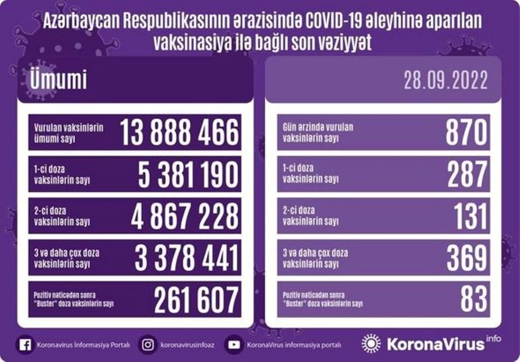 Azərbaycanda son sutkada koronavirus (COVID-19) əleyhinə 870 vaksin vurulub.Nazirlər Kabineti yanında Operativ Qərargahdan verilən məlumata görə, bir gündə birinci mərhələ üzrə vaksinasiya olunanların sayı 287, ikinci mərhələ üzrə vaksinasiya olunanların sayı 131, üç və daha çox doza üzrə vaksinasiya olunanların sayı 369, pozitiv nəticədən sonra buster doza üzrə vaksinasiya olunanların sayı 83 nəfərdir.