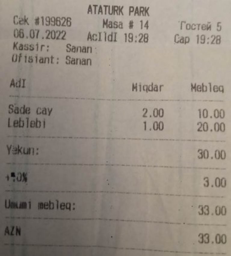 “Dünən bir dostumla "Gənclik"dəki "Atatürk" parkında çay içməli olduq. Sonunda 2 çay və 1 ləbləbiyə (dostum diabet olduğuna görə gətirilən mürəbbəni ləbləbi ilə dəyişməyi xahiş etdi - əksər yerlərdə verilən standart qabda olan adi ləbləbi idi) 33 manant pul aldılar. Çek-filan da istəməsən gətirmirlər. Dediyim ondadır ki, bu hal hələ ölkəyə turist axını 0 səviyyəsində olan bir vaxtda baş verir; gör indi turist bol olarsa nə qiymətlər olar?”, -deyə sabiq deputat etirazını ifadə edib.