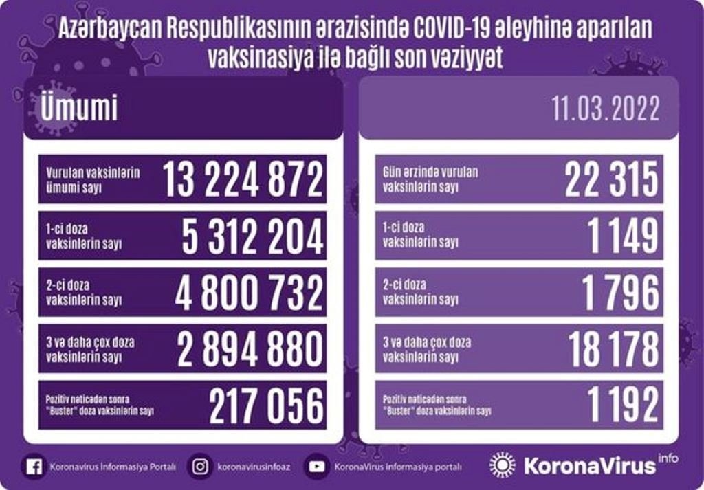 Ölkədə vurulan vaksinlərin ümumi sayı 13 224 872, birinci mərhələ üzrə vaksinasiya olunanların ümumi sayı 5 312 204, ikinci mərhələ üzrə vaksinasiya olunanların sayı 4 800 732, 3-cü və daha çox doza üzrə vaksinasiya olunanların sayı 2 894 880, pozitiv nəticədən sonra buster doza olunanların sayı isə 217 056 təşkil edir.